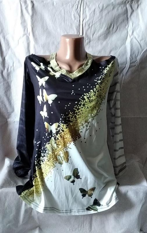 Сучасний,з чудовим принтом. Відкриті плечі. Всі виміри зроблені в спокійному (не розтягнутому) стані. ФОТО НА ТІЛІ НЕМАЄ. Довжина(по спині) 67 Завширшки(пахви) 52