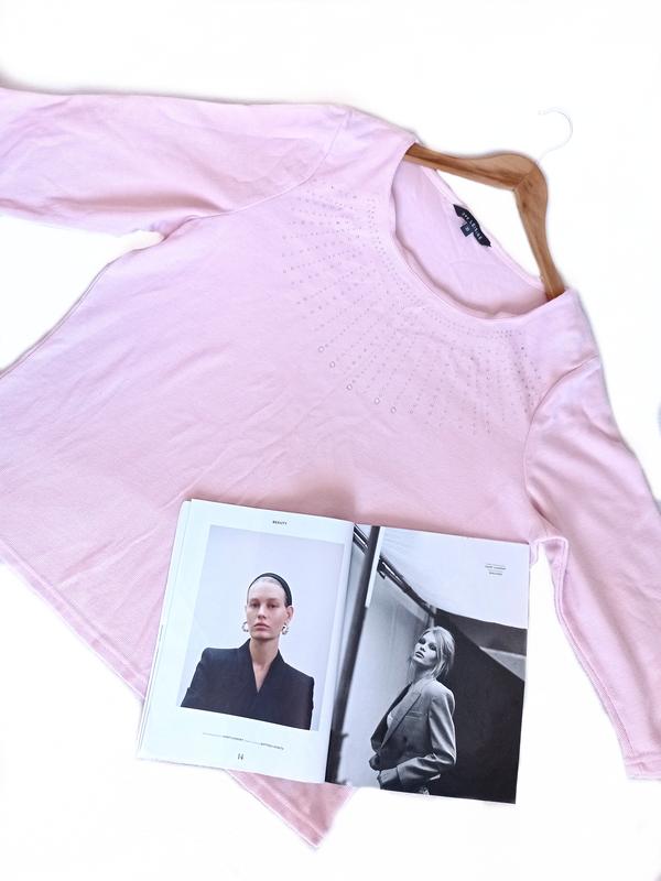 Дуже ніжна кофта, камінчики все на місці - дуже красиво блищать, щільність хороша, тканина тягнеться, на бірці розмір 20. Колір ніжно-рожевий, ближче до фото 1. ПОГ 61 см, ПОТ 61 см ПОС 61 см Довжина 68 см, Рукав 3/4.