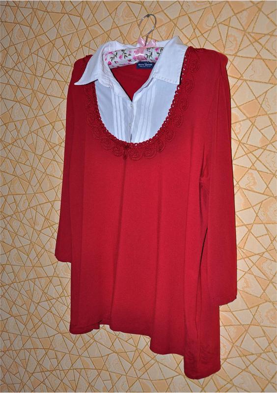 💥🔥 Осінній розпродаж! : 🎯Виразна і стильна річ у відмінному стані. Дуже красивий винний колір основної трикотажної частини з аплікацією зі шнура по горловині. Біла сорочкова частина на дотик як батист. : ⏩ Заміри: Напівобхват грудей = 56+ Напівобхват стегон (по низу) = 62+ Довжина по переду от верхньої точки плеча = 67 Рукав (3/4) = 47 : Склад тканини: 35% cotton, 65% polyester.