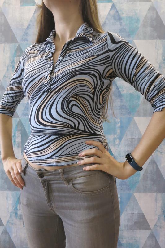 Продам кофточку з віскози/еластану розміру М, має крій подібний до блузи. Принт виглядає незвично і оригінально. Стан нормальний. Матеріал трохи затертий, але з невеликої відстані це вже непомітно.