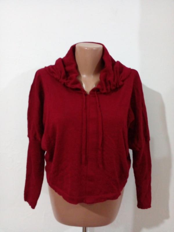 Віделадний великий комір, який можна стягнути куліскою, рукав до ліктя цільнокроєний, від ліктя в обтяжку, десь 7/8. пог-70 пот-52( по низу) рукав-62-63( від коміра) довжина-47-48