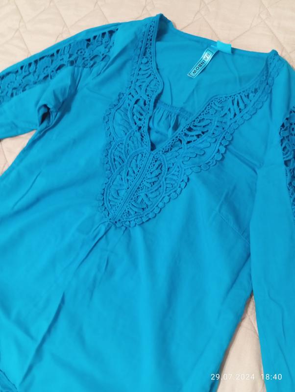Красивая, из натуральной ткани туничка, 100% коттон, производитель Индия. Цвет насыщенный, летом можно носить как Короткое платье длиной 77 см.под руками ширина 44. Нова. заказывали на сайте не подобрался размер, Размер 44 наш.