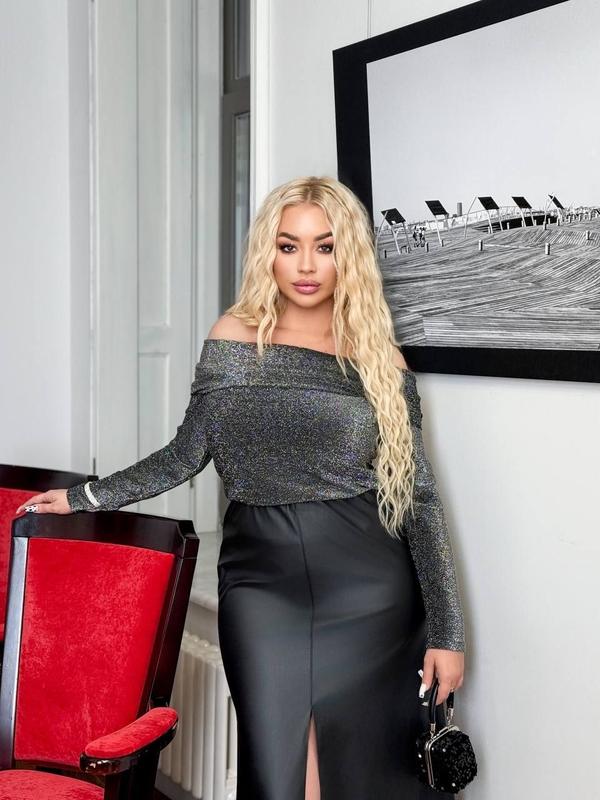 Юл 7.11 2/0070_1/2 МОДЕЛЬ ‼️ ЛЮРЕКСОВА КОФТА з відкритими плечима та довгим рукавом , прилеглого силуету надасть образу елегантності і жіночності. Тканина має еластичність, пружність і зберігає форму. ▪️ТКАНИНА : ЛЮРЕКС ТРИКОТАЖ добре тягнеться. ▪️РОЗМІРИ ПОДВІЙНІ 1- (46-48) 2-(50-52) 3-(54-56) ▪️КОЛЬОРИ: ЧОРНИЙ ЛЮРЕКС; СРІБНИЙ ЛЮРЕКС. ЗАМІРИ НА КОФТОЧКУ 1-(46-48)розмір Обʼєм грудей 96-100 Довжина рукава 56 Довжина виробу 56 2-(50-52) розмір Обʼєм грудей 104-108 Довжина рукава 58 Довжина виробу 58 3-(54-56)розмір Обʼєм грудей 112-116 Довжина рукава 60 Довжина виробу 60 НА МОДЕЛІ 46-48 р В2В