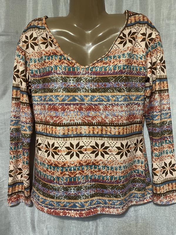 Трикотажная кофта с глубоким вирезом горловины. Замеры: длина - 66см., плечи - 52см., рукав - 58см., ПОГ - 50см., ПОТ - 45см., ПОБ - 50см