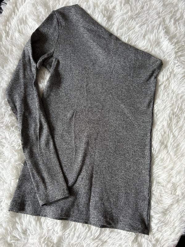 Елегантний трикотажний топ у сіро-чорну дрібну смужку, з акцентом на одне плече. Облягаючий крій підкреслює силует, а м’яка фактурна тканина забезпечує комфорт у щоденному носінні. Один довгий рукав додає стилю та асиметричної витонченості. Ідеально поєднується як із джинсами, так і зі спідницями — для вечірнього образу або стильного кежуал.