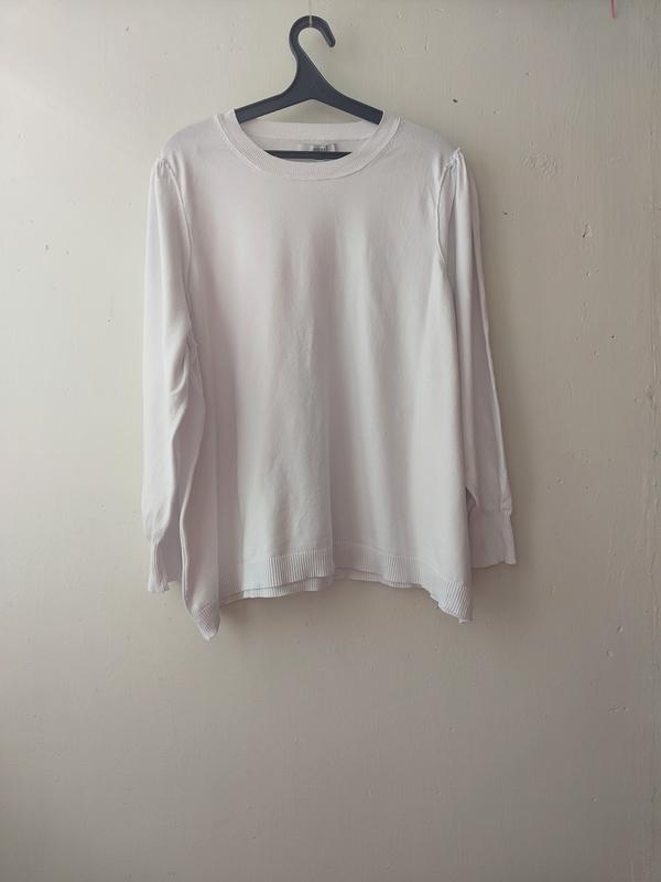 Симпатична білосніжна кофтинка на шикарні форми. Довжина 65 см, по грудях 65 см, ширина знизу 72 см, рукав 60 см.
