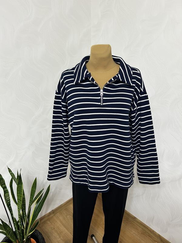 Теплий лонгслів із застібкою у білу смужку. Модель з опущеними плечовими швами, високими манжетами та воротом, який застібається блискавкою з кільцем. Склад: 50% бавовна, 50% вказаний розмір 20,підійде орієнтовно на 54/56,порівнюйте із вимірами👇👇👇 Плечі 58 см Пог 73 см тягнеться до 75 см Пот 61-73 см Пос 63-73 см Довжина по спинці від плеча 64 см Рукав від шва 51 см,від горловини 72 см,ширина по біцепсу 21 см Арт 6654.56