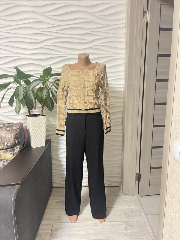 Жіноча кофта бежевого кольору з довгим рукавом. Модель приталеного крою з фактурною в’язаною текстурою та застібкою на ґудзики. Округлий виріз горловини, контрастна окантовка по низу та манжетах додає стилю. М’який еластичний трикотаж добре сідає по фігурі, підходить для повсякденних і більш елегантних образів. Стан новоі