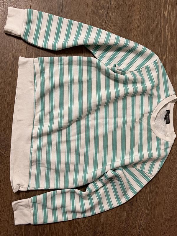 Светр в зелену полоску. Стан непоганий. Є дефекти: маленькі крапочки на рукавах. На фото показала, їх не видно, але всеодно вони є. Трошки покашлатилася також показала на фото. Розмір : xs
