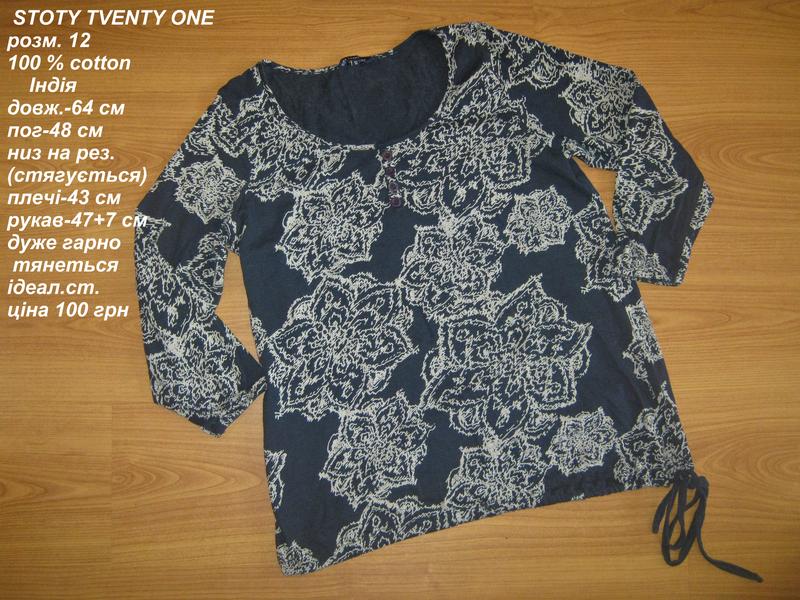 Продам гарну кофточку Stoty tventy one Індія розм.12 100 % cotton довж.-64 см пог-48 см низ на резинці (стягується) плечі-43 см рукав-47/54 см дуже гарно тянеться ідеал.ст. ціна 110 грн