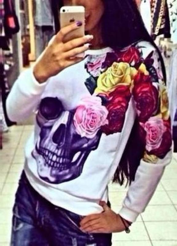 Найкрутіший реглан з черепом і трояндами розмір 36/38. Виробництво Туреччина. Дефектик - на рукаві точки жовті,(в очі не кидається), виводити не пробувала. Ціна з урахуванням дефекту. Дивіться всі мої оголошення, багато одягу, взуття та аксесуарів.