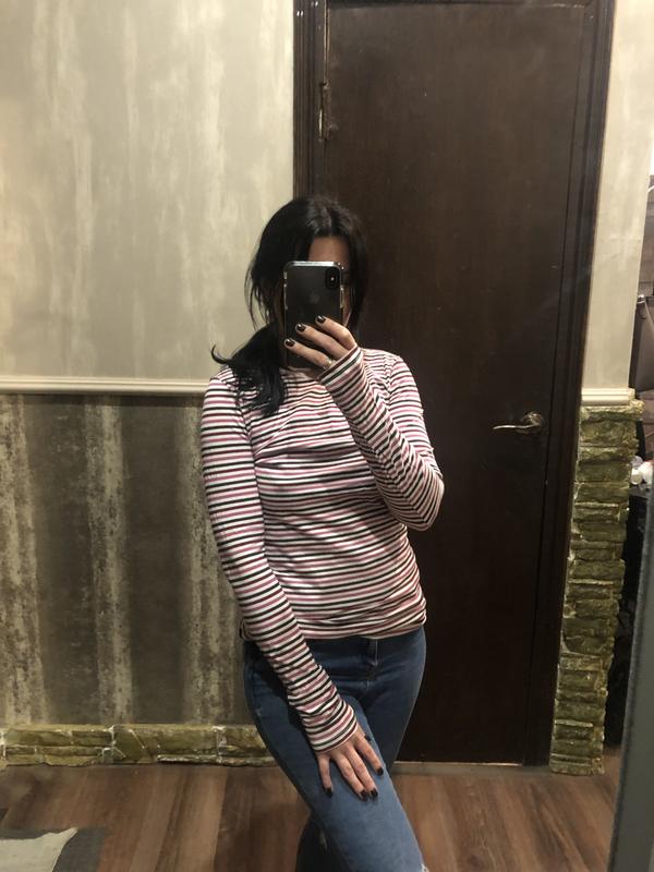 Затишний гольф у тонку смужку декількох кольорів. Тканина бавовна. Розмір S, підійде і на XS і на М , тканина тягнеться . Стан добрий. Бренд Primark Плечі по спині 35 Напівобхват грудей 40 Довжина рукава 62 Довжина виробу 66