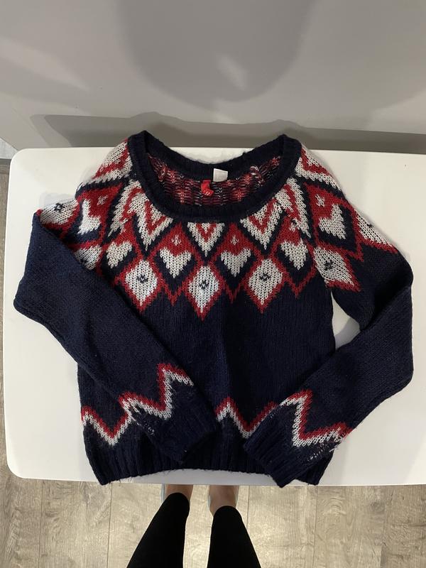 Светр в ідеальному стані, колір синій з орнаментом, розмір буде добре на хs, s. В складі акрил, шерсть, мохер.