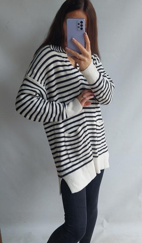 в полоску свитер с воротником, есть спереди двп кврмана,плотный. состав акрил и хлопок,не колючий длина 74 грудь 56 Рукав от горловины 72 плечевой шов спушен на бирке Л одето на ХС,на меня большой,по этому не так смотрится как на нужных параметрах