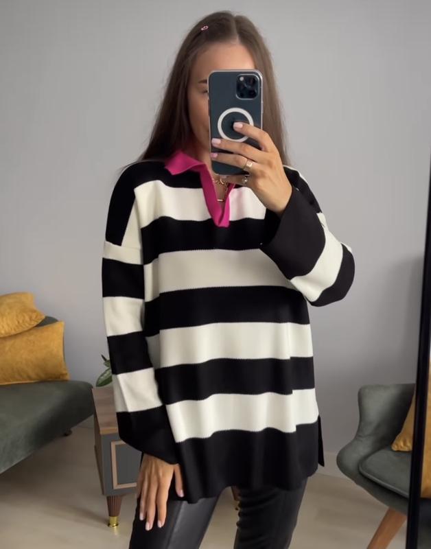 Жіночий подовжений светр у смужку. Розмір єдиний. Довжина:70 см, ширина:61 см. Відмінно буде від 42 до 52 розміру.