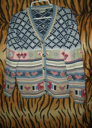Супертеплая ,фірмова,натуральна,яскравою соковитою кольору,кофта,з вывязаными натуральними нитками квітами і сердечками,застібається на гудзики попереду,об'єм грудей-108см.,довжина рукава-55см.,довжина кофти-58см.