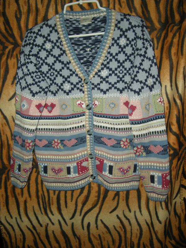 Супертеплая ,фирменная,натуральная,яркой сочной расцветки,кофта,с вывязаными натуральными нитями цветами и сердечками,застегивается на пуговицы впереди,объем груди-108см.,длина рукава-55см.,длина кофты-58см.