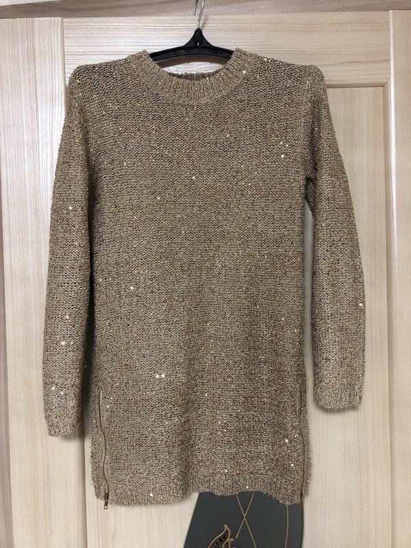 Нарядний светр з блискітками, знизу по обидві сторони замочки, відкриваються. Тканина тягнеться.