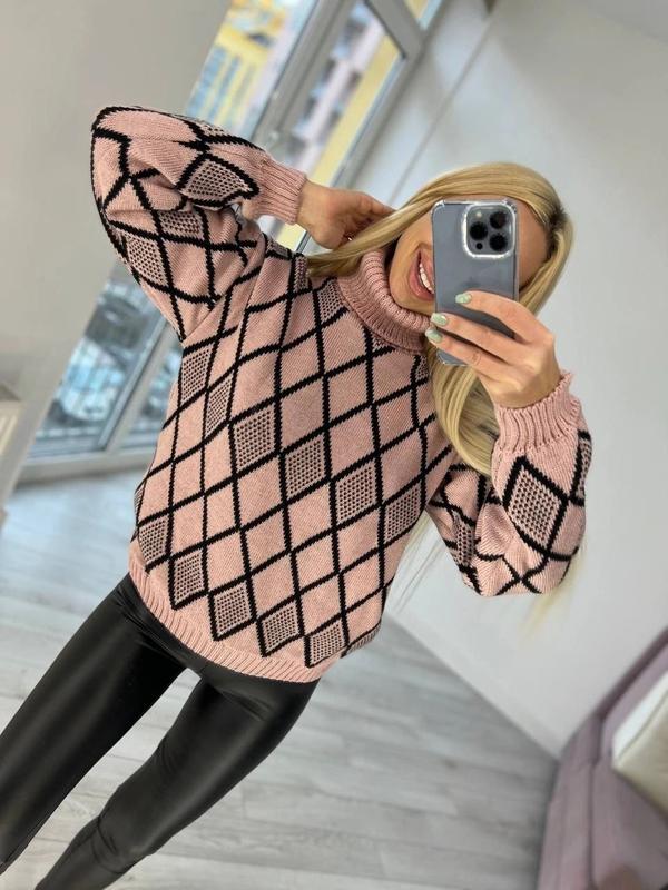 Светр Модель 5015 modn Склад: 30% акрил; 70% вовна Розмір: універсальний 42-52 Заміри: - довжина по спинці 63-64см; - довжина рукава від горловини 76 см; - ширина светра 52-62см. Кольори: - основний молоко + темна пудра; - основний чорний + світла пудра; - основний темна пудра + молоко; - основний світла пудра + чорний; - основний джинс + сірий