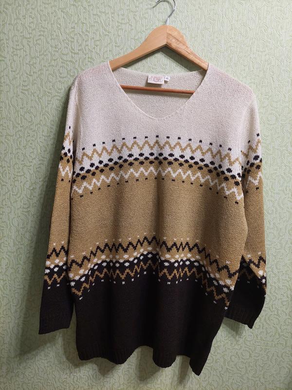 комфортный базовый свитер из мягкого трикотажа с узором фэйр-айл,модель свободного кроя оверсайз в нейтральной бежево -коричневой гамме в скандинавский орнамент, выполнен простой вязкой , низ и манжеты рельефная обвязка резинкой, из текстурной буклированой пряжи 100% акрил, не кошлатится и не деформируется при носке , линия плеч слегка приспущена 45, грудь 62, низ 57, длина 77, рукав 60