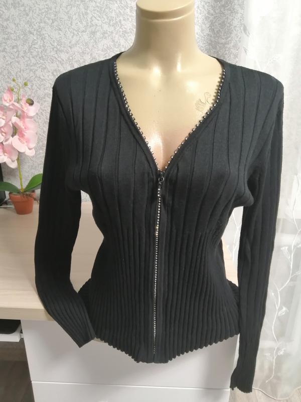 Жіноча чорна, тепла кофта на блискавкі з стразами, розміром М, L. В ідеальному стані, м'якенька, приємна до тіла, дуже гарно тягнеться. З 71% віскози та 29% нейлону. Навіть вдягали на 52 розмір, тільки короткувата. Довжина 58,ПОГ-48,ДР-61,ШР в горі 16, в низу 9см. Сідає по фігурі ідеально. Всі заміри зроблені не розтягуючи виріб.