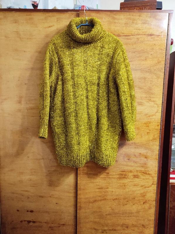 Новое платье-свитер фирменное , золотого цвета , травка , замеры на последнем фото .