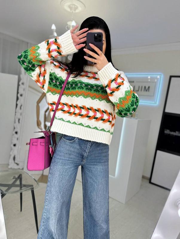 Светр ✅щільна в‘язка (кашемір - 50%, вовна 43%, віскоза 7%) ✅заміри вироба - довжина по спинці 51 см, напівобхват по грудях 58 см, довжина рукава від горловини 76 см ✅розмір єдиний 42-46 ✅кольори моделі - синій візерунок, зелений візерунок, блакитний візерунок
