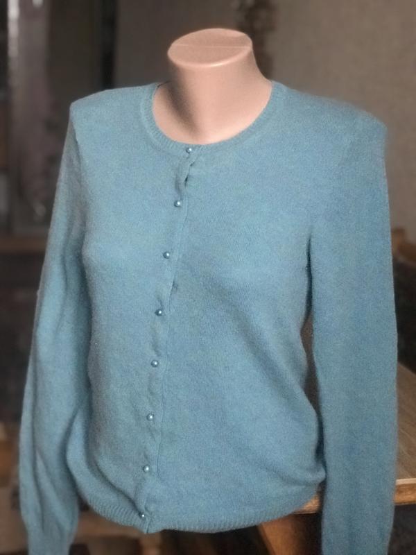 гарної якості приємний та ніжний на дотик вовна Дуже добротний светрик, гарної якості приємне на дотик м'який відтінок бврюзовий. Фасон вільний теплий, зовсім не колючий ПОГ 44см довжина рукава 63см довжина кофта 64см