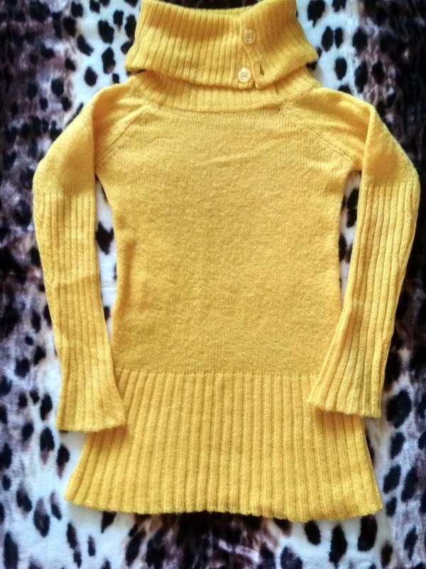 Теплый свитер - туника с актуальным воротником, регланы - рукава. С добавлением махера. Цвет: насыщенный жёлтый. Из - за структуры пряжи есть "рыхлость", на последнем фото видно Размер: S Замеры: ПОГ: от 41 см (сильно тянется) ПОБ: от 43 см (сильно тянется) Длина по центру спинки от горловины: Внимание! Чем сильнее растягивать в ширину, тем короче он становится!!!