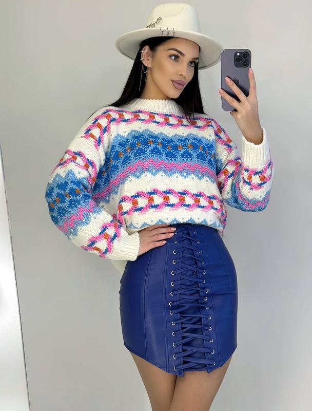 Светр ✅щільна в‘язка (кашемір - 50%, вовна 43%, віскоза 7%) ✅заміри вироба - довжина по спинці 51 см, напівобхват по грудях 58 см, довжина рукава від горловини 76 см ✅розмір єдиний 42-46 ✅кольори моделі - синій візерунок, зелений візерунок, блакитний візерунок