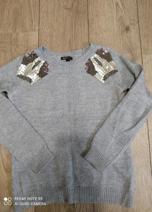 Mango светр шерстяний, натуралий, бірка зрізана но коли Ви його потрогаете то самі це зрозумієте, дуже гарний на плечах усі бусіни пришиті. По бірці розмір L, але насправді на S