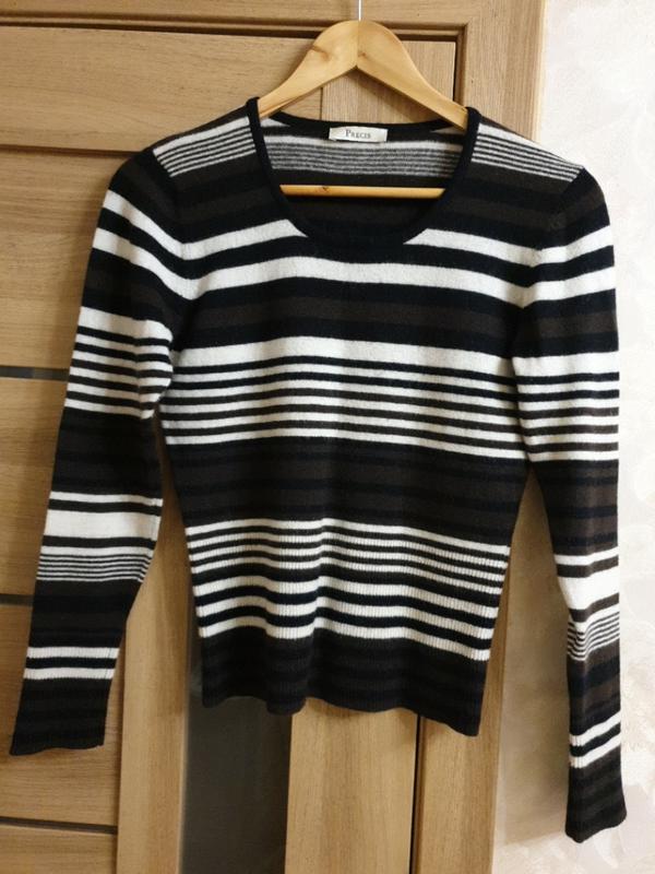Светр Precis у смужку з вмістом вовни, теплий та м'який (склад тканини на фото з біркою). Розмір S та відповідає замірам. Колір смужок чорний, коричневий та молочний. Заміри без розтягнення напівобхват під рукавами 43 см, напівобхват талії 38 см, напівобхват низу светра 36 см, довжина рукавів від плеча 60 см. Стан дуже хороший. Додаткові фото та заміри по запиту