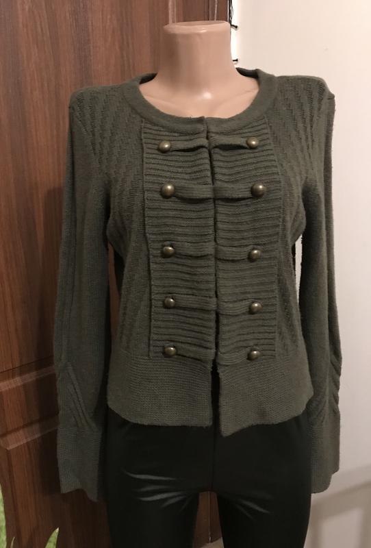 Теплый сверт. Размер M. Длина с воротником 46 см. Рукав 63 см. ПОГ 48 см. Застегивается на крючки. Цвет темная оливка. Состав : шерсть, катон, полиамид, ангора. Стан - идеальный. Лосины M. Очень темная оливка