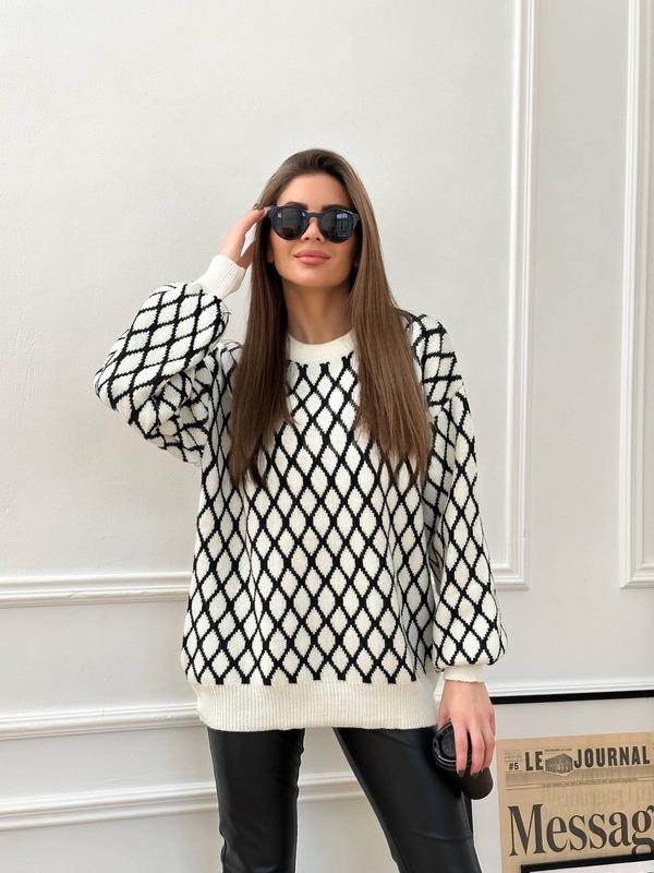 ТОВАР КЛАСУ ЛЮКС 🖤🤍 ЕФЕКТНИЙ І ЗАТИШНИЙ СВЕТР ІДЕАЛЬНЕ ПОЄДНАННЯ СТИЛЮ, КРАСИ І ЗРУЧНОСТІ З ПЕРШОЇ ХВИЛИНИ ОБВОЛІКАЄ ВАС М'ЯКІСТЮ, НІЖНІСТЮ І ТЕПЛОМ СВЕТР ВІЛЬНОГО КРОЮ З КРУГЛИМ ГОРЛОМ І ЧАРІВНИМИ ОБ'ЄМНИМИ РУКАВАМИ, ВИГОТОВЛЕНИЙ З ВИСОКОЯКІСНОГО ТРИКОТАЖУ МАШИННОЇ В'ЯЗКИ БІЛОГО КОЛЬОРУ З ОРИГІНАЛЬНИМ ЧОРНИМ ДЕКОРОМ СВЕТР ЗІГРІЄ ВАС В ХОЛОДНЕ ВИТТЯ РОКУ, СТВОРИТЬ ГАРНИЙ НАСТРІЙ І ЗАЙМЕ ГІДНЕ МІСЦЕ У ВАШОМУ ГАРДЕРОБІ ДОВЖИНА ВИРОБУ 66 СМ РОЗМІР ЄДИНИЙ оверсайз КОД 0287