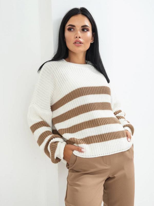 Перед замовленням уточніть наявність у вайбері ********** або у чаті магазину!! В‘язаний джемпер з бавовни. Ідеальний стильний варіант для повсякденної носки ▪️Склад: 100% бавовна ▪️Кольори: Чорний-кемел Молоко-кава Молоко-оливка Молоко-блакитний ▪️Розмір : 42-46