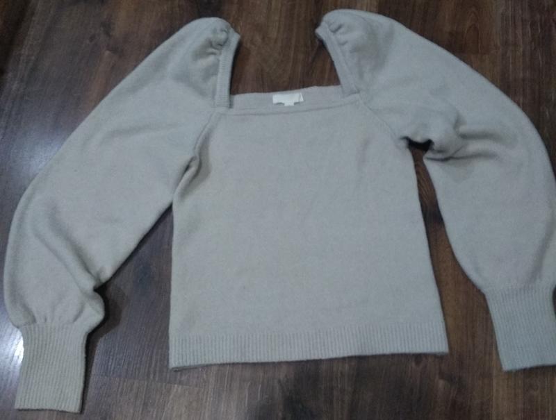 Свитер стильный, в красивом состоянии. Красивого очень светлого серого цвета, мягкого, теплого. Красивый широкий рукав, манжет, в плечевом шве вшита резинка, чтобы держалась. Плече-фонарик.