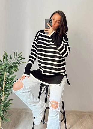 🌷Новинка🌷 Улюблений подовжений светр оверсайз у смужку. Чудова якість 💥 Топ продажів 2023 Реал фото👌 # 0182 ▪️Виробник Туреччина 🇹🇷 ▪️Колір: чорний та білий ▪️Розмір єдиний 42-46 ▪️Склад тканини:Акрил 70%, Вовна 30% Цена : 650 грн