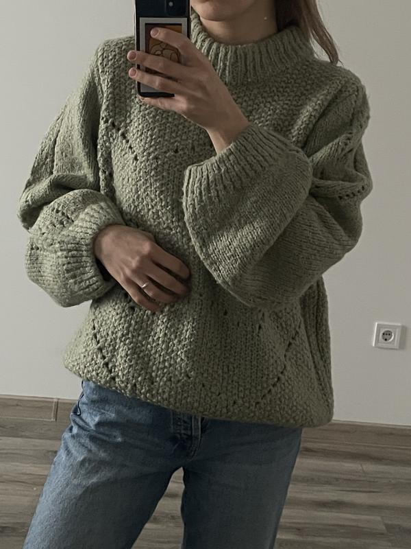 Теплый свитер с интересной вязкой и широкими рукавами фисташкового цвета. Размер XL, одето на S