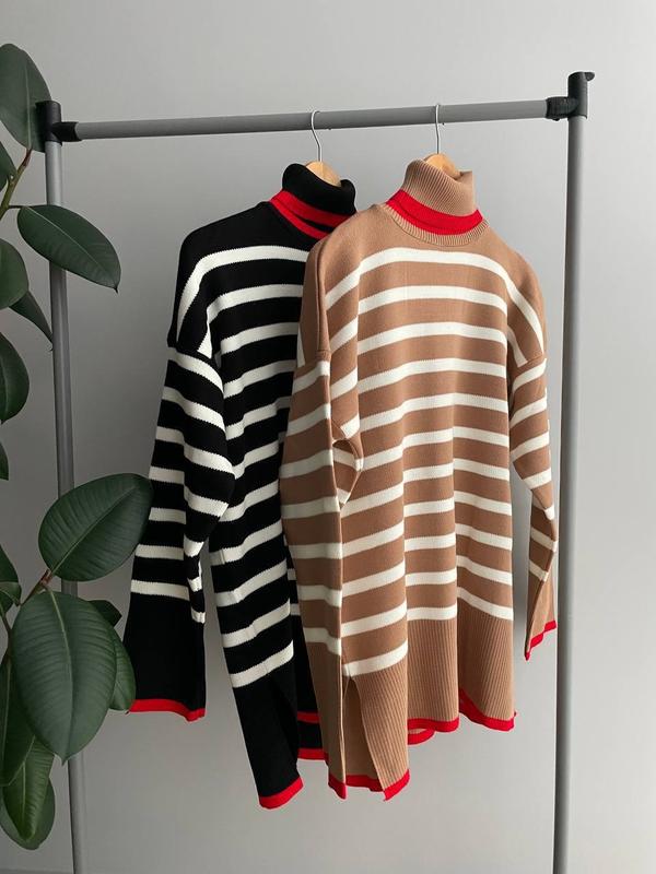 Супер стильний светр🔥 Яскраве доповнення вашого гардеробу – трикотажний светр у смужку з високим коміром. Модель має оригінальний дизайн із розрізами у бокових швах. Трендова смужка з червоним кантом. Тканина: машинна в'язка (50% акрил 50% котон) Виробник: Туреччина Розміри: one size 42-46 Колір чорний, бежевий