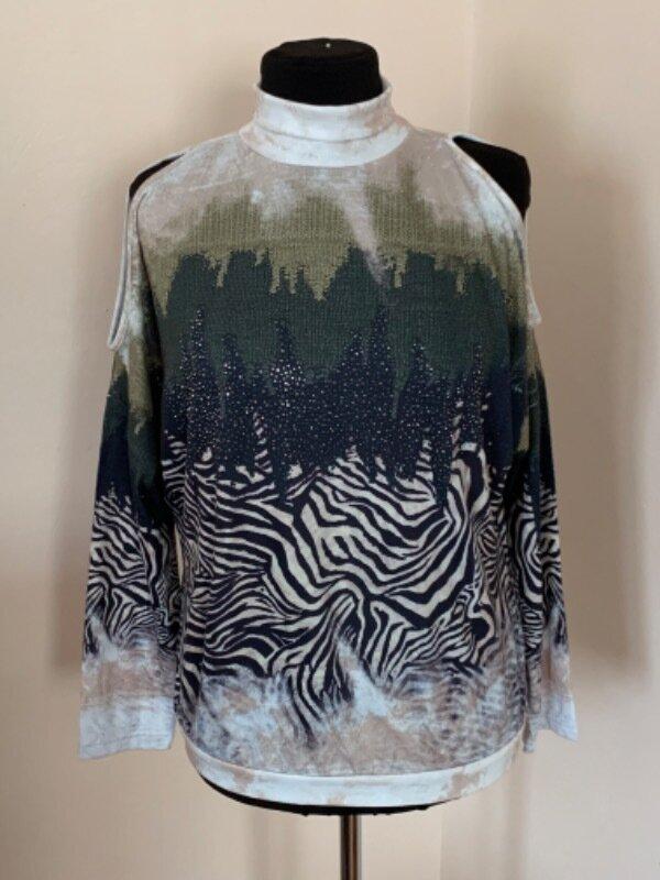 Класна річ в новому стані, та без ярликів. Трикотаж важкий, з віскози шерсті і еластану. Придбана в Малазі дорого, розмір 46 європейський вказано було. Довжина- 67см, рукав від горловини- 78см, пог- 63см( фасон кажан), півоб‘єм низу- 54см. На плечах є розрізи , перед оздоблено камінцями.