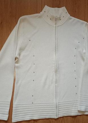 Женская белая кофта, на декоративной с камушками молнии. Длина 60см, длина рукава 58см, Ног 53. Состав: 50% шерсть, 30% акрил, 20%