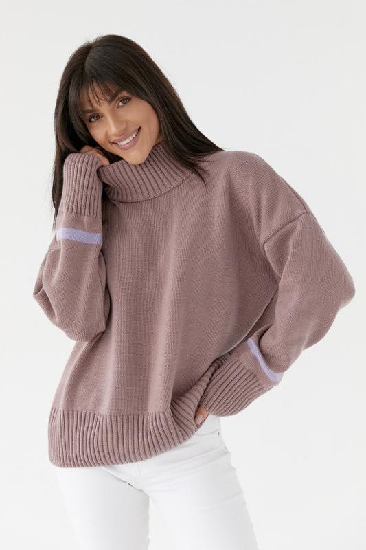 В'язаний жіночий светр. Розмір універсальний 46-54. Склад -- 50% вовна 50% акрил. Зріст моделі на світлині 168 см. Дуже стильний светр вільного крою, комір-стійка. Чудовий вибір у зимову пору року.