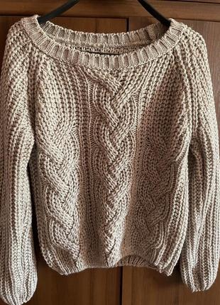 В‘язана кофта крупної в‘язки. Низ кофти на резинці. Склад: 50% вовна, 50% акрил. Розмір універсальний.