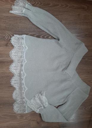 Трендовий ветрик з кружевом, дуже ніжний. Не жаркий. Стан ідеальний. на С буде трошки оверсайз. На М буде в розмір. Можна носити на одне плече. Шерсть з акрилом, прати вручну. Стан ідеальний. Колір сіро-м'ятний