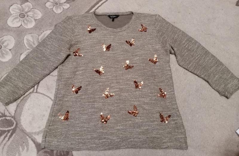 Класний светрик меланжевий, гарний м'який, з метеликами ( паєтки). Туреччина. Йде на 50-52. Колір як на фото. Дивіться заміри: Плечі 48см, в грудях 54 см, довжина від середини плеча 68см, ширина внизу 60см, рукав 54см . Є трохи катишки, По бокам вшита, бо була великувата. Відповім на ваші запитання. Відправляю Укр і Новою поштою.