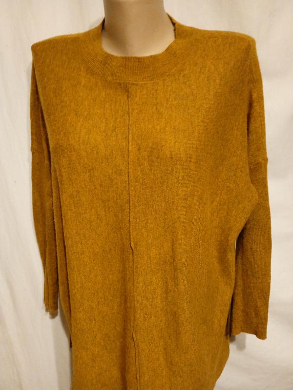 светр гірчичного кольору,як на фото,м'який,приємний,,довжина70,пог65,рукав від горловини 75см,рукав приспущений переходить в завужений ...частина рукава в рубчик внизу ширина рукава10см, вгорі в місці шва ширина рукава 15см,,склад трикотажу,45%віскоза,8%вовна,47%поліамід,трикотаж тягнеться,ширина по низу64,є розрізи внизу з боків по 20см