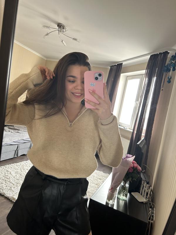 Дуже приємний до тіла. Стильний. Якщо застібнути молнію то буде закрите горло