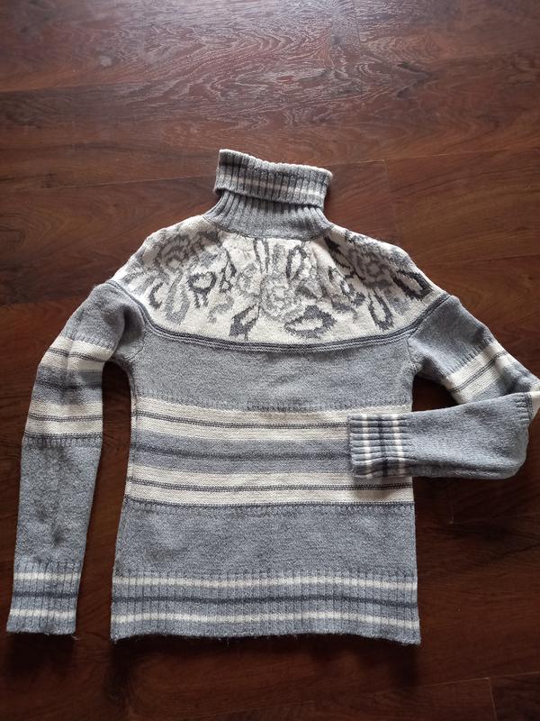 Свитер в бело-серых тонах.Размер 44 ,или s.Свитер под горло с отворотом,рукав реглан.Свитер в хорошем состоянии,без дефектов.Рукав реглан от шеи 68,длина свитера56.ширина низа 41.ширина в груди 48.