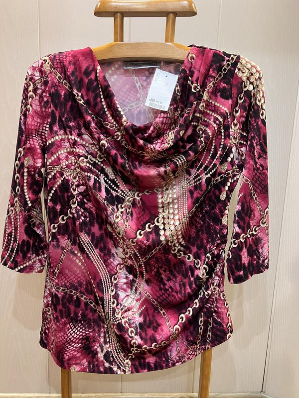У наявності кофточка фірми GEORGE SIMONTON. Розмір на бирці вказаний М, але за вимірами йде на 14. Склад: 96% поліестер і 4% еластан, тканина тягнеться. Напівоб'єм у грудях (НОГ) — 54 см, тканина добре тягнеться Довжина — 68 см Плечі — 39 см Довжина рукава — 45 см Півобвід у стегнах (НОС) — 52 см, тканина ще добре тягнеться
