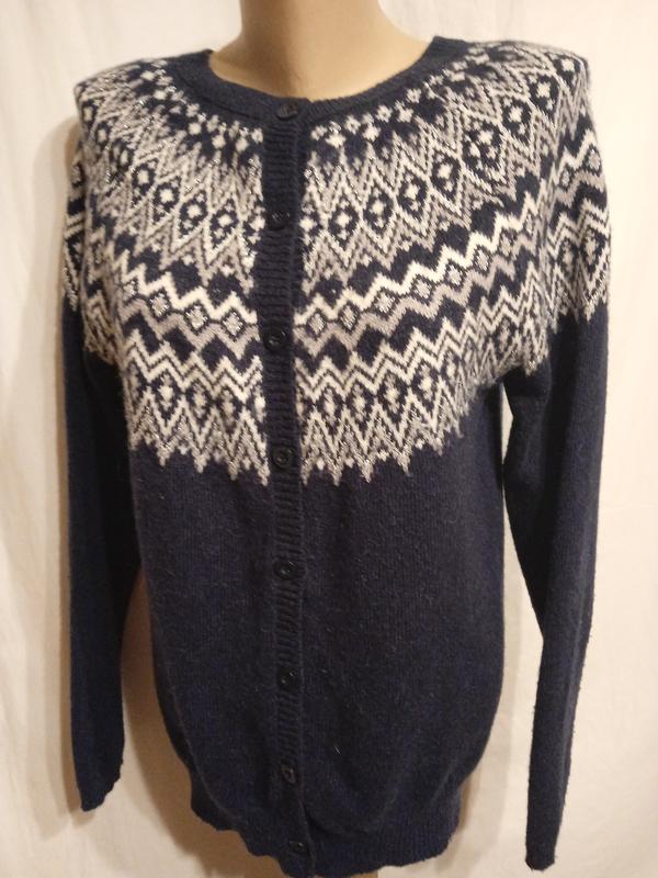 светр дуже гарний,нарядний,м'який,теплий,чудовий жаккардовий візерунок ,основний колір темносиній,хороший склад трикотажу,вовна,альпака,акріл,довжина68,пог52,рукав від горловини76см.